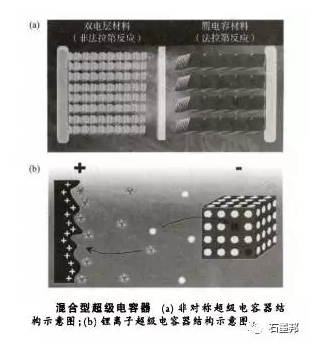 混合型超級(jí)電容器一般是指由不同類型正負(fù)極電極材料組成的器件:一極是含贗電容電池材料,另一極是雙電層電容器材料?;旌闲团K電容器結(jié)合了雙電層材料的快速充放電和贗電容的高能m密度的特性,可同時(shí)具有高功率密度和高能量密度,彌補(bǔ)了在電池和超級(jí)電容器兩者不可兼得的空缺。